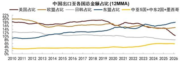 先看贸易对象之变。关税战以来,我国对美出口大幅下降,但东盟、中东、拉美、非洲迅速形成补位。