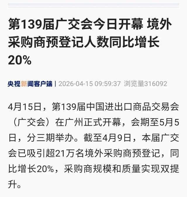 刚刚,2026年春季广交会启幕,展位总数7.57万个,参展企业超3.2万家,均超往届水平,超20万名境外采购商完成预注册,同比增长20%。